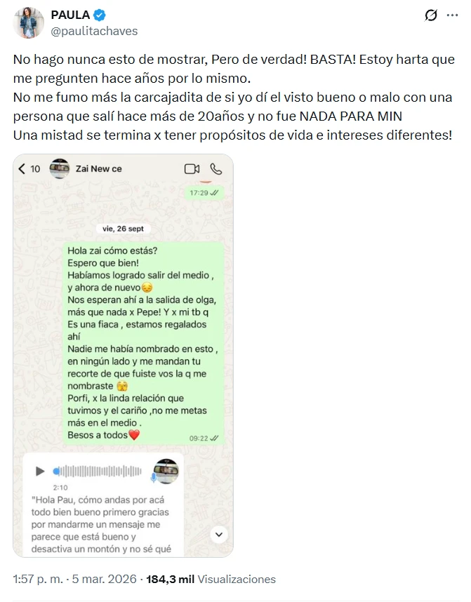 Vale decir que además, antes de exponer ese chat, Paula dijo: "X dios BASTA! Dejen de nombrarme! Y de una vez x todas entiendan que no fue por eso nuestro distanciamiento! Se lo aclaré varias veces a Zaira, incluso la última vez hace unos meses,le pedí que no me nombre más y me pidió perdón x hacerlo, justificando que se pone nerviosa con la notas ! Entiendo que es más fácil creer que fue x un hombre y no entender que muchas veces los valores que uno tiene y los intereses de cada uno, hacen que una amistad se termine!”.