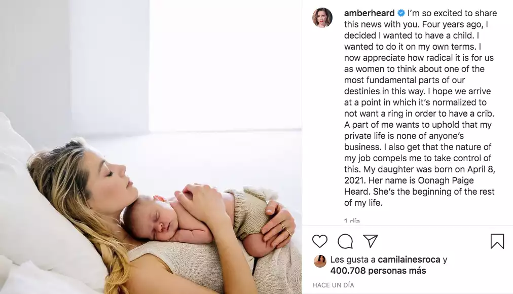 En un emotivo posteo en su cuenta de Instagram y junto a una fotografía de la recién nacida recostada sobre su pecho, Heard comunicó: "Estoy muy emocionada de compartir esta noticia con ustedes. Hace cuatro años, decidí que quería tener un hijo. Quería hacerlo en mis propios términos". Así comienza su escrito en el que cuenta cómo fue su experiencia de ser madre.