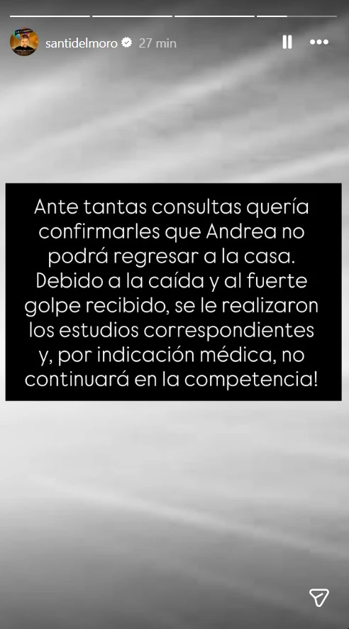 En ese mismo mensaje, detalló los motivos detrás de la decisión: “Debido a la caída y al fuerte golpe recibido, se le realizaron los estudios correspondientes y, por indicación médica, no continuará en la competencia”.