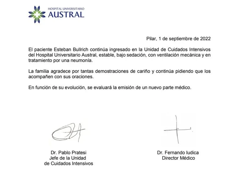El documento había sido firmado por por los doctores Pablo Pratesi, jefe de la Unidad de Cuidados Intensivos, y Fernando Iudica, Director Médico del nosocomio. "El paciente Esteban Bullrich continúa ingresado en la Unidad de Cuidados Intensivos del Hospital Universitario Austral, estable, bajo sedación, con ventilación mecánica y en tratamiento por una neumonía”, afirmaron.