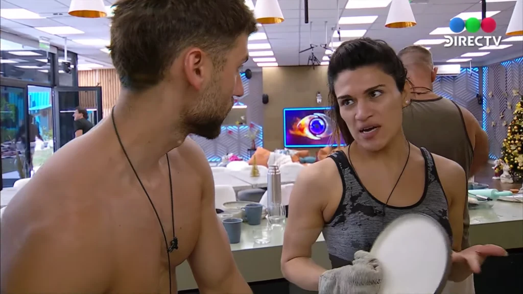 Así fue como se dio un diálogo entre Santiago Algorta y Luciana Martínez, quienes buscaban tapar su propia conversación con el ruido del agua mientras lavaban los platos y definían los roles de varios participantes, así como sus alianzas.