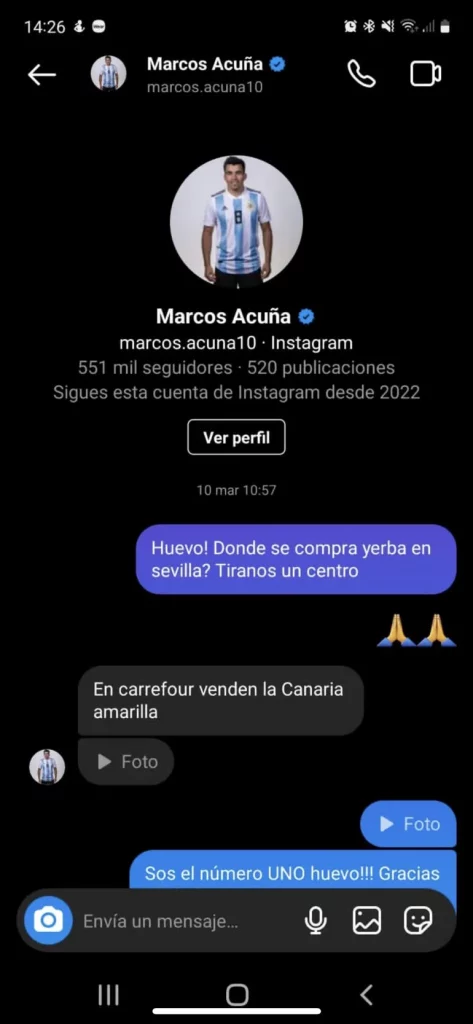 Mientras paseaban por las calles sevillanas, le escribieron iniciando el chat en Instagram con Acuña: "¿Huevo, dónde se compra yerba en Sevilla? Tiranos un centro".