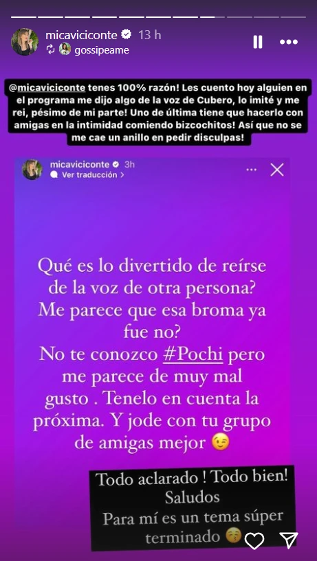 “Uno de última tiene que hacerlo con amigas en la intimidad comiendo bizcochitos. Así que no se me cae un anillo en pedir disculpas", agregó. Y, minutos después, Mica replicó ese mensaje de pedido de disculpas en sus redes y añadió: "¡Todo aclarado! ¡Todo bien! ¡Es un tema superterminado!".