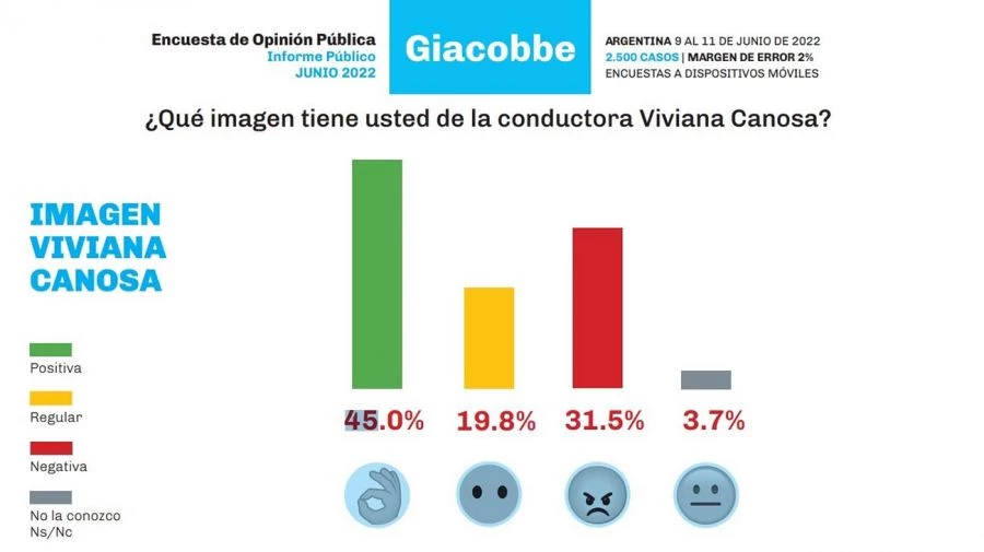 Finalmente los resultados de la encuesta aparecieron, midió su imagen y los resultados sorprendieron. La consultora del analista político Jorge Giacobbe, Giacobbe & Asociados, y que es panelista en el programa de Canosa que se emite por A24 fue la encargada de medir a la periodista.