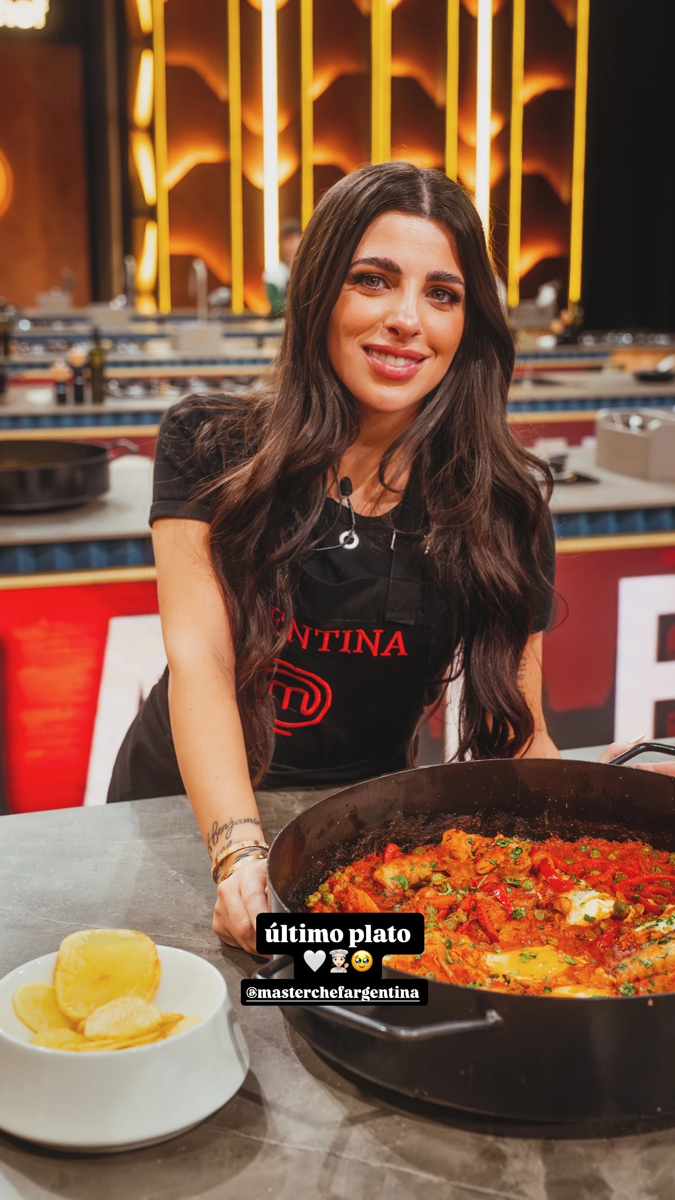 En la primera imagen que compartió, se la ve en la cocina del reality, luciendo el delantal característico del certamen y mostrando el plato que preparó en su última participación. Sobre la foto, escribió: “Último plato”, acompañado de corazones y la etiqueta oficial del programa. El plato, presentado en un disco, está compuesto por un contundente pollo a la portuguesa, mientras que a un costado se observa la guarnición de papas españolas. Esta imagen simboliza el cierre de una etapa que, según sus propias palabras, la llenó de aprendizajes y emociones.