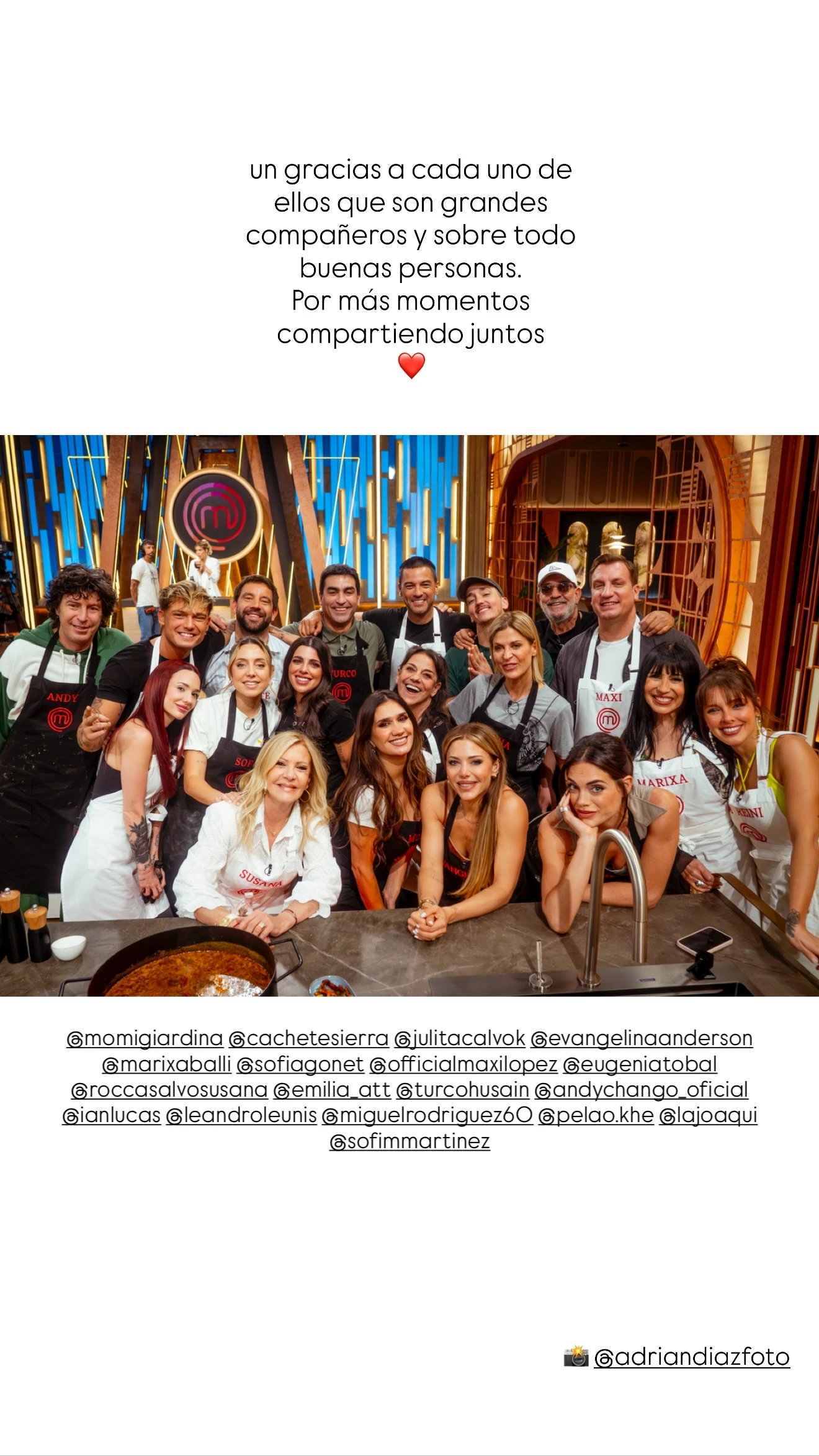 En su tercer posteo, Valu eligió una imagen grupal con todos los participantes del reality, tomada en el set de MasterChef. En la parte superior, escribió un mensaje que resume su experiencia: “Un gracias a cada uno de ellos que son grandes compañeros y sobre todo buenas personas. Por más momentos compartiendo juntos”. Debajo, etiquetó a cada uno de los concursantes y figuras del programa, reforzando la idea de que su salida no estuvo vinculada a problemas internos, sino que fue una decisión personal.