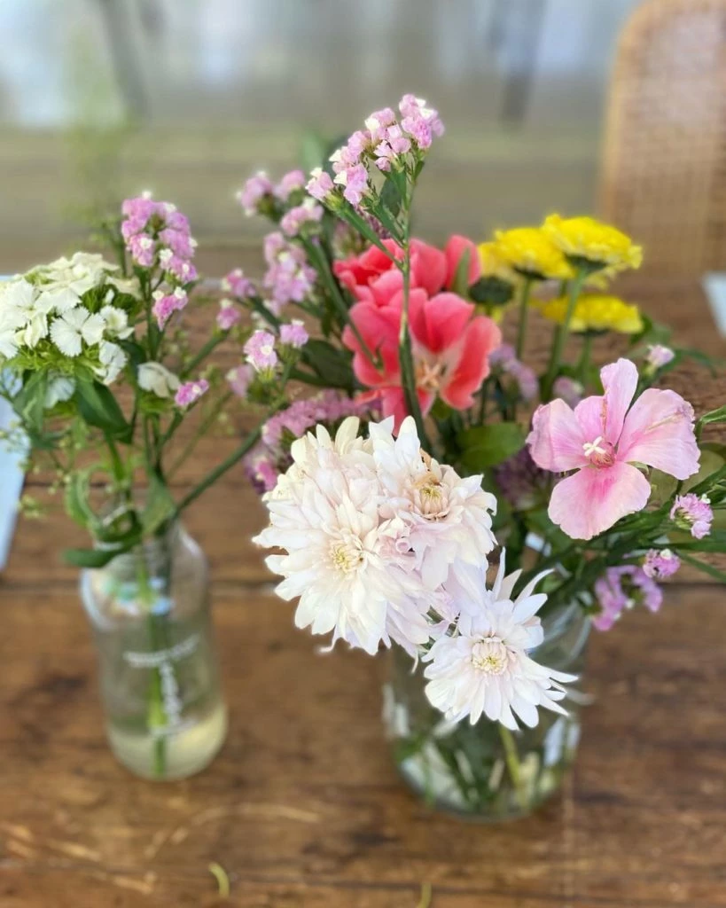 ¿Lo que no debe faltar en el comedor de Vero Lozano? Los frascos con flores de muchos tonos que toman protagonismo al ser centros de mesa.