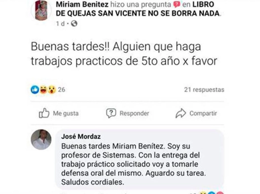 La joven se manifestó en un grupo de Facebook llamado “Libro de Quejas San Vicente no se borra nada”, en ese contexto la alumna escribió: “Buenas tardes! ¿Alguien que haga trabajos prácticos de 5to año x favor”. Hasta ese momento, la joven desconocía que su profesor, José Mordaz, también era miembro del grupo de Facebook.