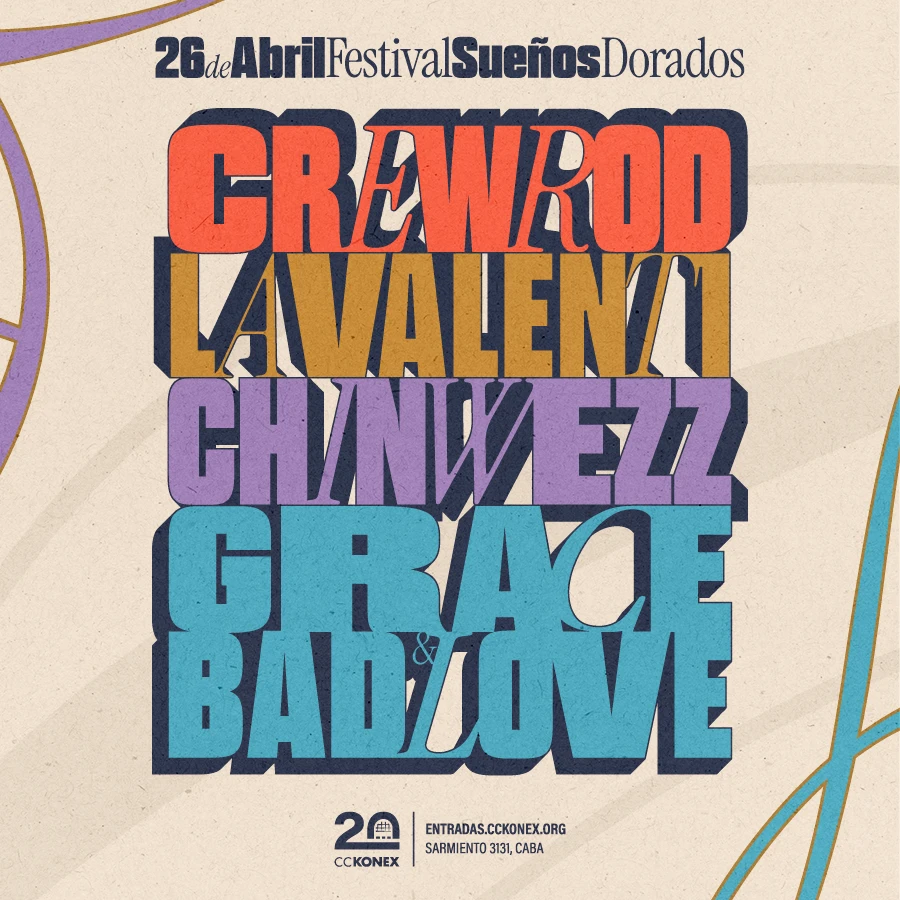 Después de tres ediciones que lograron consolidarlo dentro del circuito alternativo, el Festival Sueños Dorados vuelve a tomar el Ciudad Cultural Konex el próximo domingo 26 de abril desde las 17. Con un line up que incluye a Crewrod, La Valenti, Chinwezz y Grace & Badlove, la propuesta apunta a consolidar un espacio donde conviven distintas expresiones artísticas.