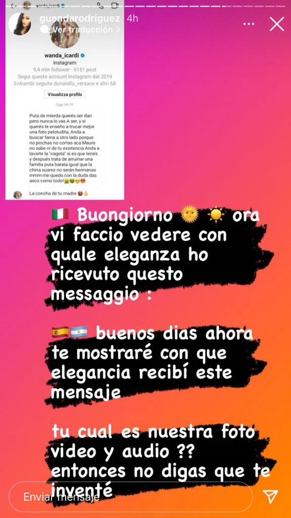 Como era de esperarse y fiel a su estilo, Wanda no utilizó eufemismos para dirigirse a Guendalina. "Buenos días, ahora les mostraré con qué elegancia recibí este mensaje", anticipó la autoproclamada amante de Icardi en sus Instagram stories. Recordemos que la noticia dio vuelta al globo y fue levantada por cientos de portales europeos.