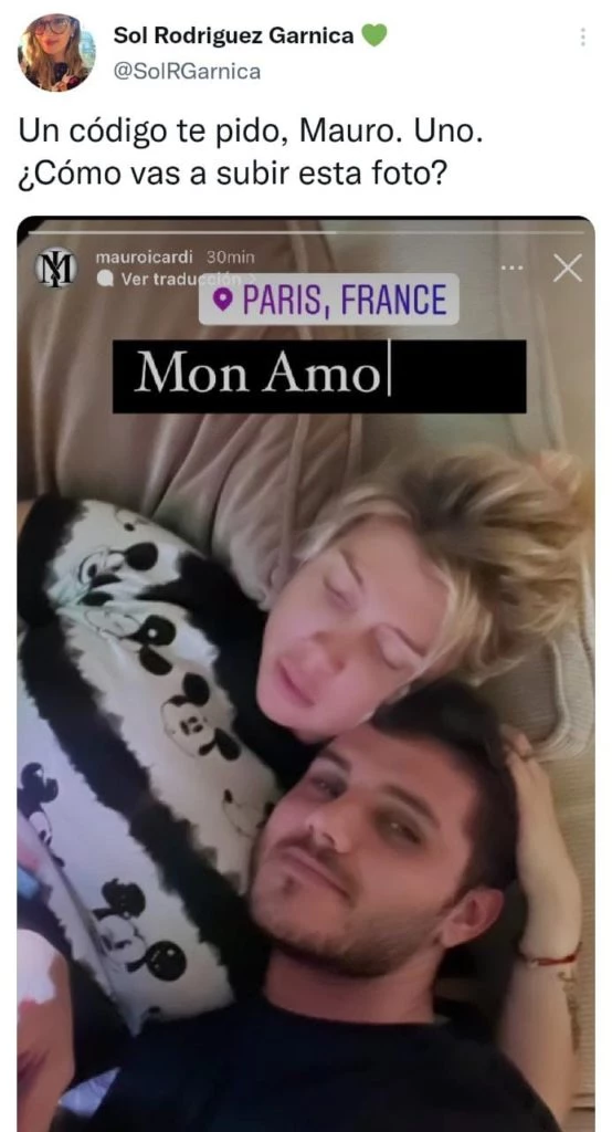 Por si fuera poco, Mauro publicó en sus Instagram Stories una imagen desde la intimidad del hogar que tienen en la capital francesa y despertó una ola de críticas por la elección de la imagen donde se lo ve él sonriente tomarse una selfie junto a Wanda, quien aparece "a cara lavada" y con una expresión de tristeza en su rostro. "Mon amour (mi amor)", escribió y agregó un emoji de corazón junto a la fotografía.