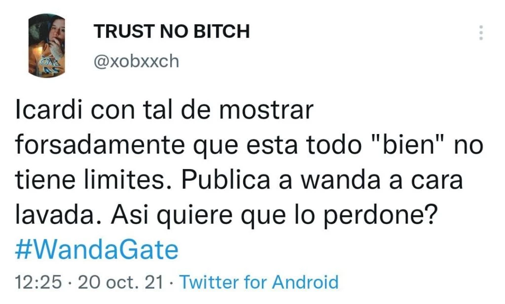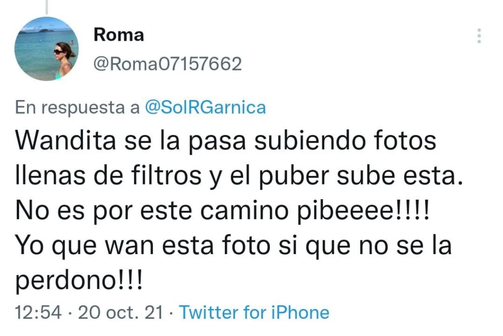 "Un código te pido, Mauro. Uno. ¿Cómo vas a subir esta foto?", "La historia que subió Icardi de Wanda a cara lavada, ¿el chabon quiere que lo dejen dos veces en una semana o qué?", "Icardi con tal de mostrar forzadamente que está todo bien no tiene límites. Publica a Wanda a cara lavada. ¿Así quiere que lo perdone?", "Es más grave subir foto de tu pareja durmiendo que sextear con otre SIN LUGAR A DUDAS", "Ese sí es motivo de separación", "Wandita se la pasa subiendo fotos llenas de filtros y el puber sube ésta. No es por este camino pibe! Yo que Wan esta sí que no se la perdono!", entre otros, fueron los comentarios que expresaron los internautas en la red social del pajarito.