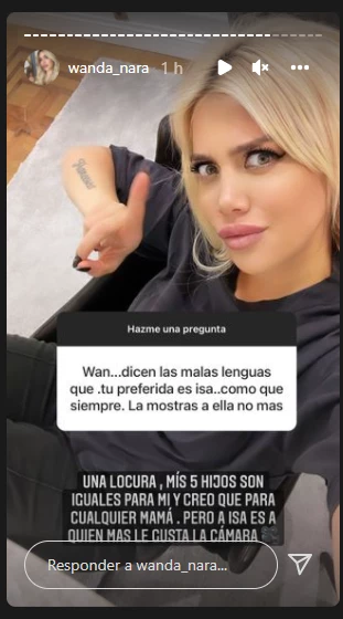 Otro usuario le comentó: "Wan, dicen las malas lenguas que tu hija preferida es Isa. Siempre la mostrás más a ella". Frente a este comentario, Nara fue tajante: "Una locura. Mis 5 hijos son iguales para mí", y agregó: "Isa es a quien más le gusta la cámara".