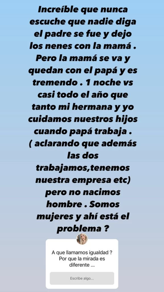 Del mismo modo, agregó: "Una noche versus casi todo el año que tanto mi hermana como yo cuidamos de nuestros hijos cuando los papás trabajan... (Aclaro que además las dos trabajamos, tenemos nuestra empresa, etc.). Pero no nacimos hombres, somos mujeres... ¿Ahí está el problema?".