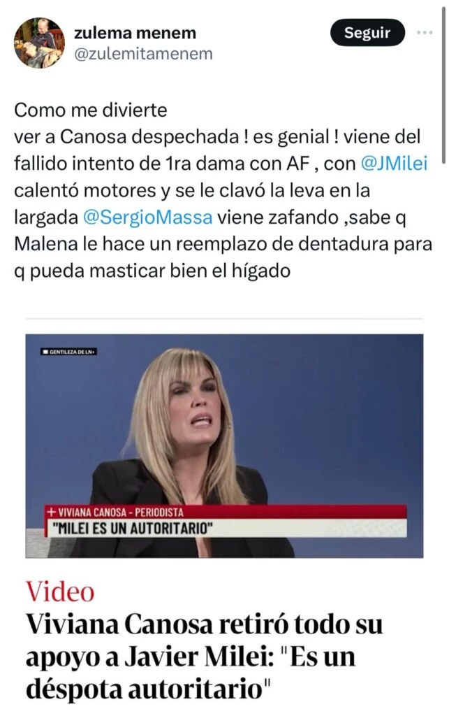 Tras escuchar estas declaraciones, Zulemita Menem se despachó contra la periodista con un picante mensaje a través de su cuenta de X: "Como me divierte ver a Canosa despechada. Es genial. Viene del fallido intento de primera dama con AF, con Javier Milei calentó motores, y se le clavó la leva en la largada", comenzó escribiendo.