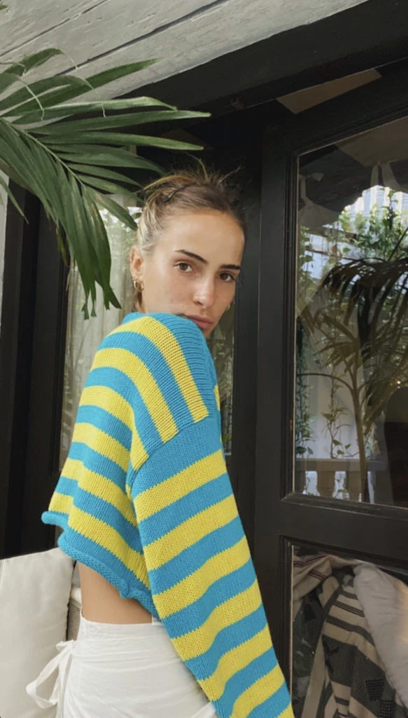 La joven vistió un suéter cropped de tejido calado que se llevó todas las miradas por el contraste de tonalidades: turquesa y amarillo. Una prenda que dice verano a gritos y que es ideal para usar enb un after beach cuando la brisa fresca de mar empieza a hacer su efecto.