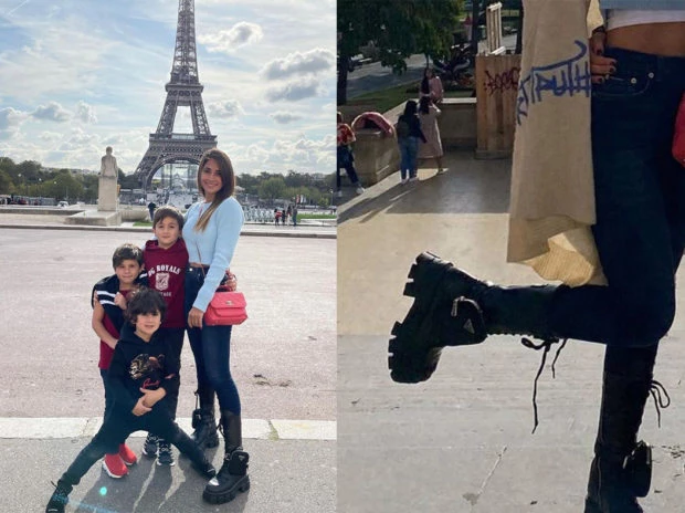 En una postal con la Torre Eiffel de fondo y junto a sus tres hijos, Ciro, Mateo y Thiago Messi, Antonella sorprendió por su look. Fiel a su estilismo urbano y funcional, la empresaria optó por un look integrado por jeans y un sweater crop top color celeste.