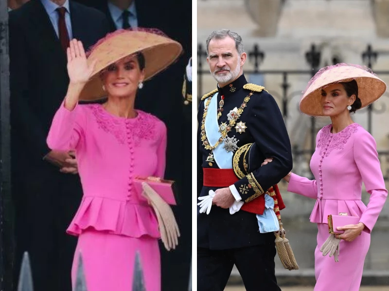 La reina de España fue de las más aplaudidas con su look "rosa chicle". La monarca sorprendió con un elegante dos piezas de Carolina Herrera que, sin duda alguna, terminó de definir con el sombrero oriental con el que se robó todas las miradas.