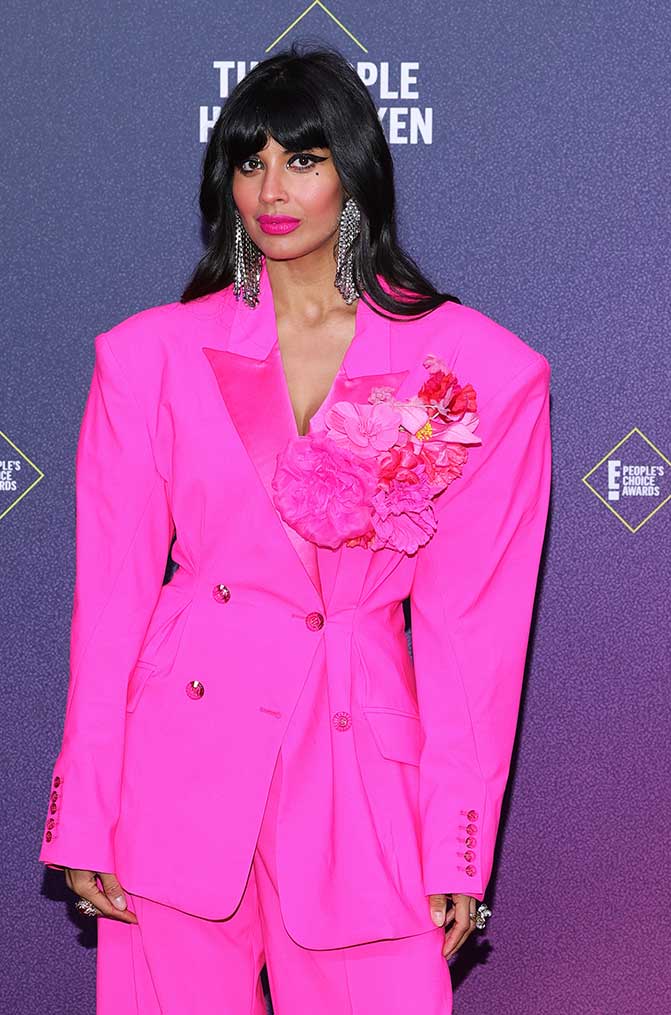 Jameela Jamil también apostó al maxi volumen. La presentadora se rió de sí misma al compartir cómo transformaba su look en el auto, del que bajó espléndida en un tailleur fucsia de Christopher John Rogers.