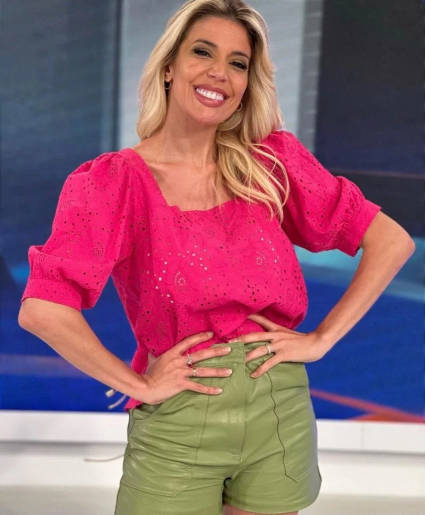 Virginia Gallardo eligió una osada combinación de colores, que este verano 2022, fue tendencia: color frutilla con verde manzana. Short y blusa en esta divertida y original mezcla de tonos que deja en evidencia que la panelista de Intrusos está muy interiorizada sobre cuál es la paleta de esta temporada.