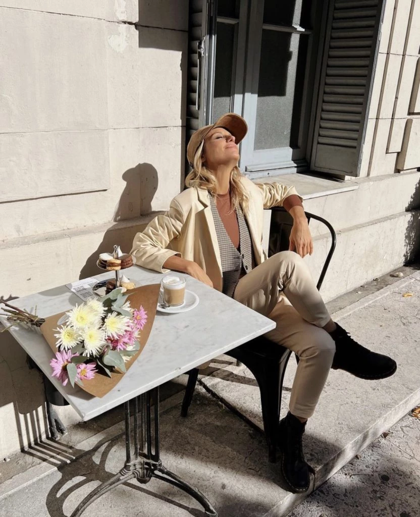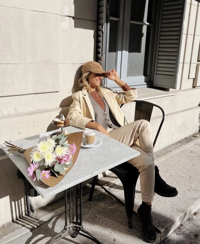 La conductora mostró el glamoroso outfit que eligió para un cafecito de fin de semana: pantalones y blazer color crudo, remera color chocolate y un chaleco a cuadros. Completó el look con un par de borcegos negros. Mariana Fabbiani... !Reina total!