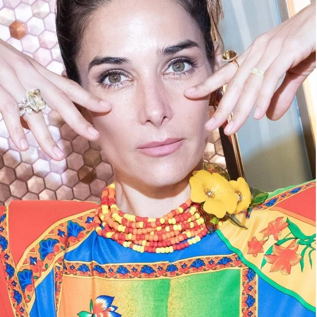 Y este mediodía, en Almorzando con Mirtha Legrand, fue por más y apostó a un vestido de creap de jean de seda natural estampado de línea suelta con mangas en gasa degradé, que acompañó con joyas de Jean Pierre: unos aros oval con citrinos y brillantes, muchas pulseras esclavas multicolor con esmeraldas, brillantes y zafiros amarillos y rosas, un anillo central citrino, y sinfines de esmeraldas y zafiros amarillos.