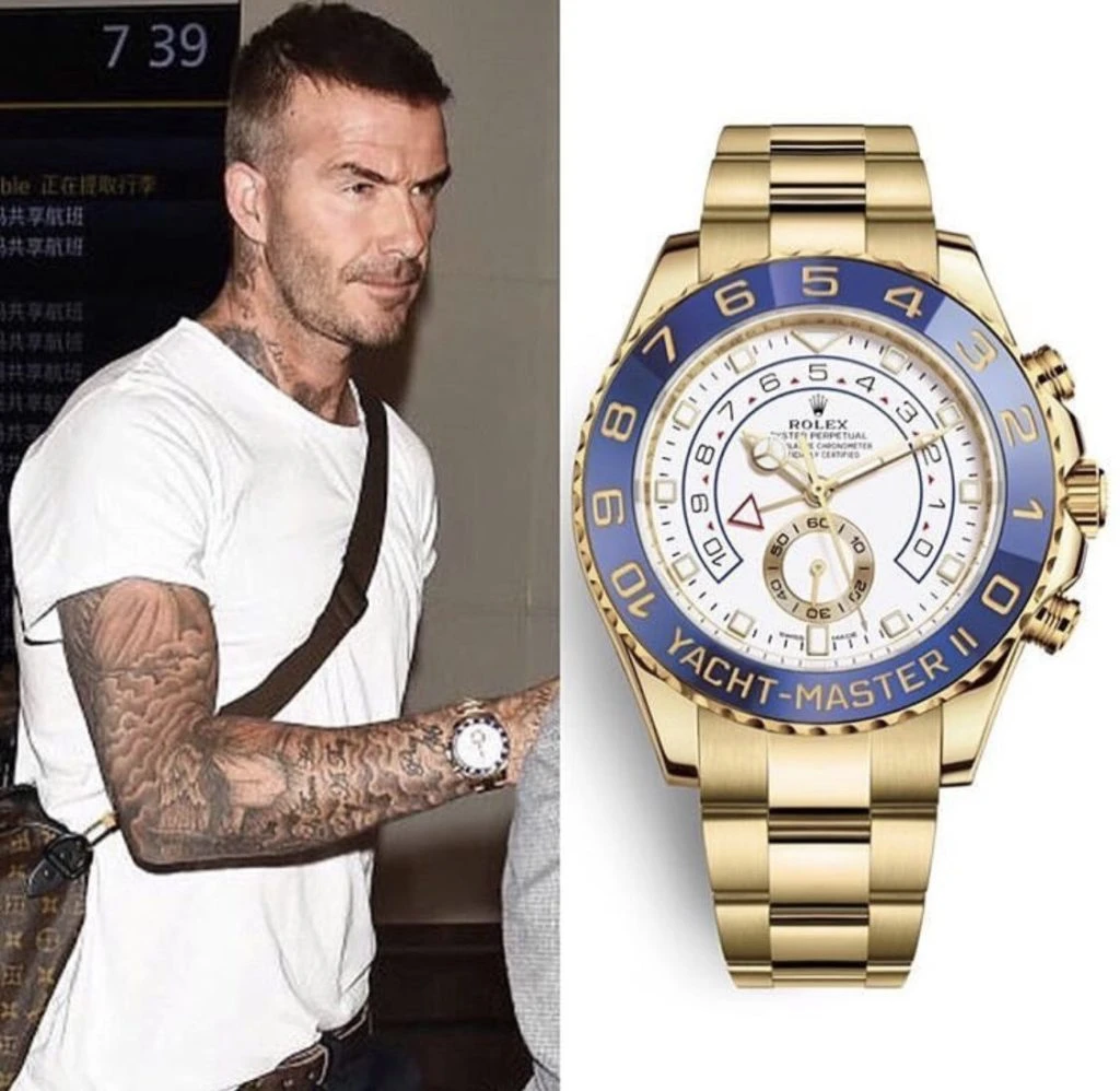 El ex jugador de fútbol es uno de los más devotos de los Rolex. Su Yatch-Master de Oro amarillo de 18 kilates es todo un clásico, que de hecho personalizó con correa de cuero. Otro de sus modelos preferidos es el Submariner, que suele intercambiar con Victoria Beckham, fanática del Day-Date de oro amarillo.
