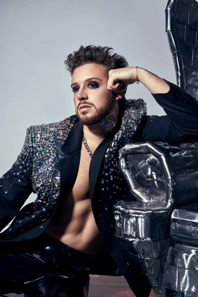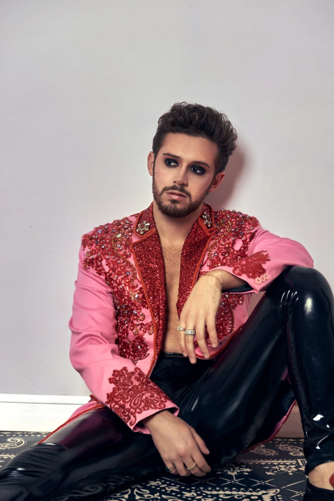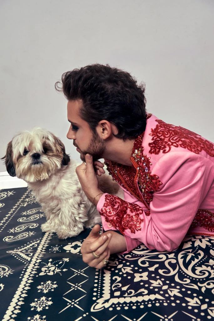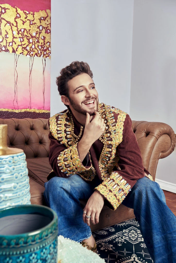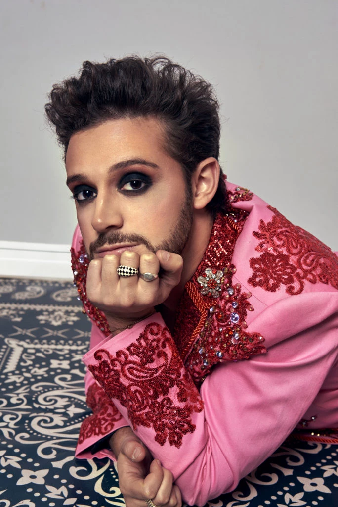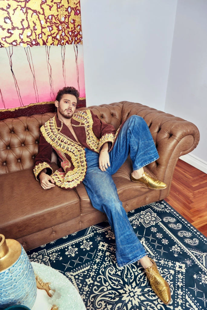 El artista luce un maxi blazer de corderoy en tono chocolate, bordado a mano con galoneria en dorados. Realzado con cristaleria swarovsky multicolor. A modo de complemento se lucieron jeans tiro alto corte retro, pata elefante y zapatos haciendo juego en tono de cuero croco dorado.