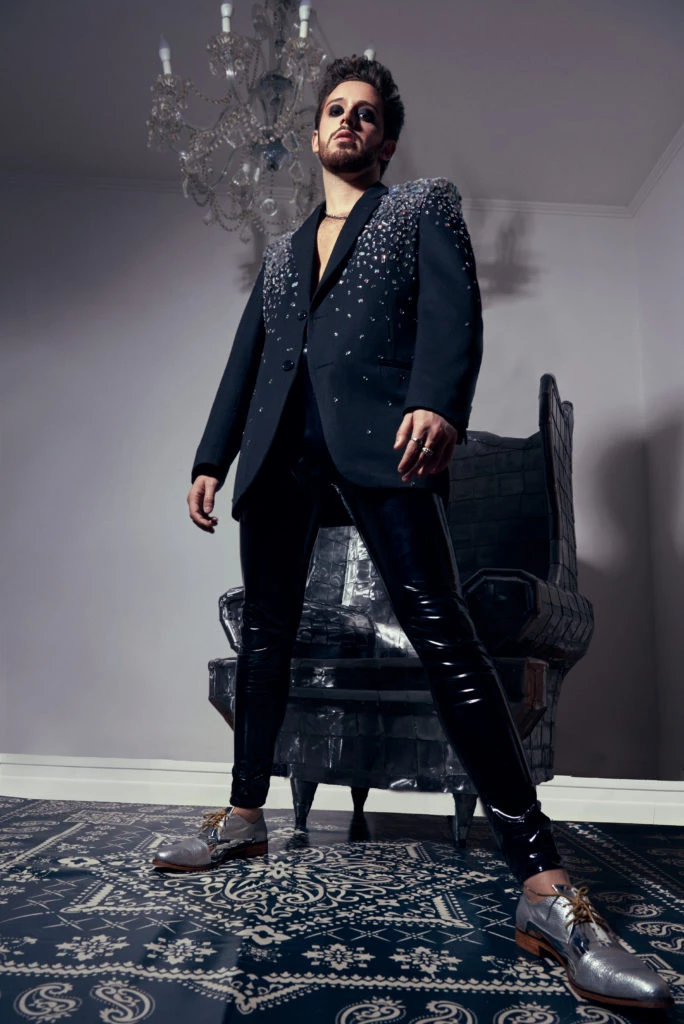 El diseño consta de una pieza clasica de sastreria negra, con un bordado a mano efecto concentracion y dispersion de elementos en distintas formas y tamaños de cristalería en aurora boreal y plateado. Lo combinó con unos pantalones slim fit de charol y zapatos metalicos en tono plateado.