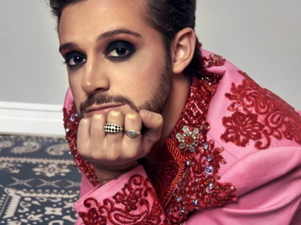 El artista luce un maxi blazer de corderoy en tono chocolate, bordado a mano con galoneria en dorados. Realzado con cristaleria swarovsky multicolor. A modo de complemento se lucieron jeans tiro alto corte retro, pata elefante y zapatos haciendo juego en tono de cuero croco dorado.