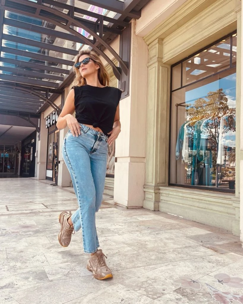 Para un paseo de tarde, Mery eligió el sumun de la simpleza: jeans celestes, camiseta negra anudada y zapatillas deportivas. Desprovista de bijou y llevando por único accesorio unas gafas negras, la actriz demostró que, a veces, “menos es más”.