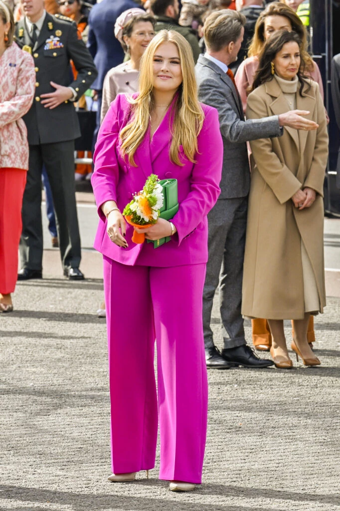 La heredera al trono demostró ser también heredera del estilo de su madre, adoptando looks en tonos llamativos y vibrantes. Esta vez fue de la mano de un outfit compuesto por traje de corte sastrero en tono fucsia que combinó con una cartera verde de Jacquemus y zapatos en tono nude.