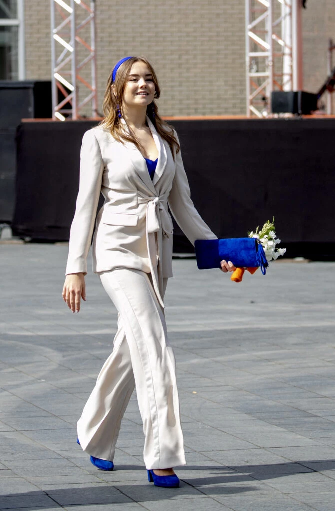 A diferencia de su hermana y su mamá, la princesa Ariane se destacó por lucir un traje claro y con un único guiño a los otros atuendos: unos zapatos azul eléctrico, mismo tono de la bincha, la remesa de base y el sobre que eligió.