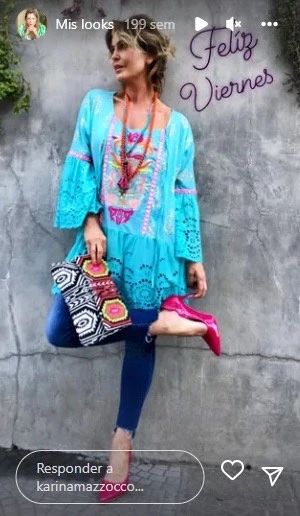 3. Cuando elige el Boho chic -estilo que nunca pasa desapercibido- lo "baja" con un zapato bien clásico. Incluso, lo combina estos outfis con cartera neohippie que sigue la línea de la blusa y el colgante. Súper diez para Karina.