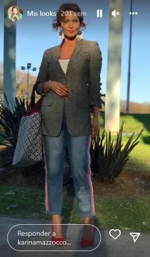 7. El colorado siempre está presente en el guardarropas de Mazzocco: lo combina con los degradés en la gama de rosados y corales. Jeans, blazer gris y stilettos de color.