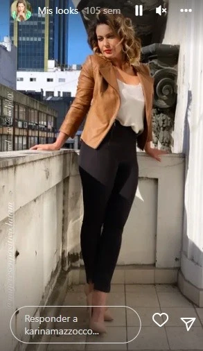 5. Es amante del nude. En el otro extremo, Karina elige muchas veces looks súper simples. Elige prendas clásicas en telas y colores netos. No hay recortes ni volados ni estampados. Todo es básico: musculosa blanca, leggins negros, campera de cuero tostada y stilettos color piel. Impecablemente natural