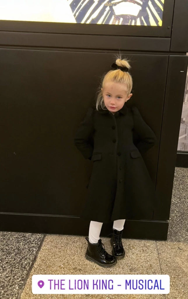Por la noche, ambas se vistieron de gala y asistieron a la función de The Lion King, el clásico musical de Broadway. Con un total look black, la pequeña posó en la marquesina del teatro y lució un hermoso tapadito negro.