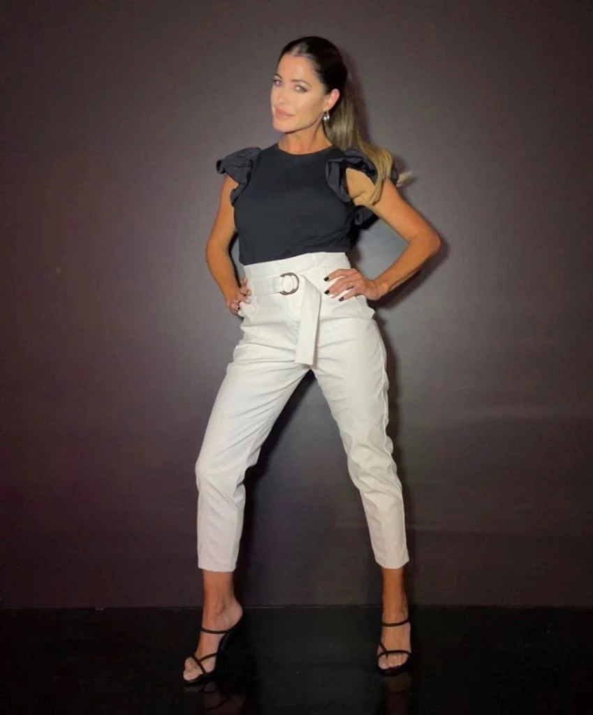 Esa vez eligió optar por un paper bag blanco y lo combinó con una romántica blusa con volados en las mangas.