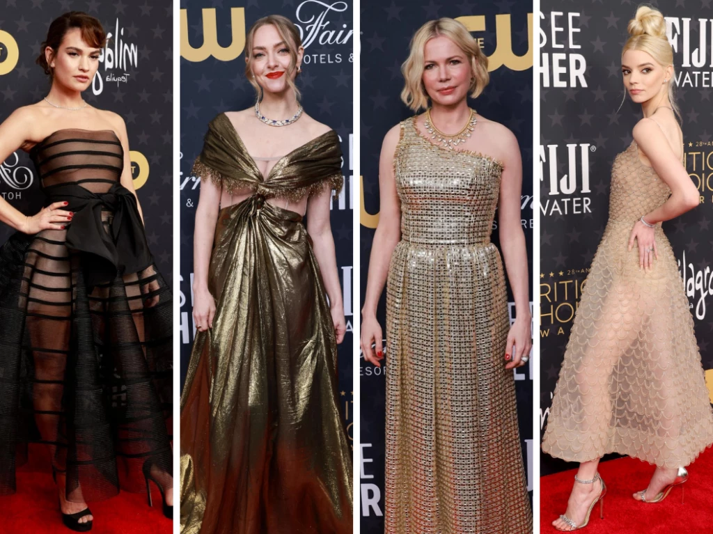 Las nominadas en los Critic Choice Awards –ceremonia que, por norma general, es menos clásica e invita a la creatividad– captaron la atención de las cámaras con diseños atrevidos, en los que los protagonistas terminaron siendo el dorado y las transparencias.