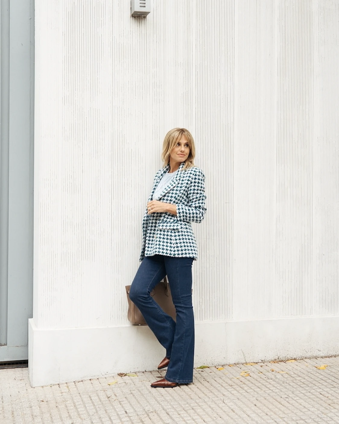 Al margen de los suéteres, no puede dejar de mencionarse una de las prendas más extravagantes con las que se la pudo ver. Combinación de estilo y elegancia. Se trata de un saco verde y blanco de pied de poule de calce irregular con cruce en el frente y cuatro botones dorados.
