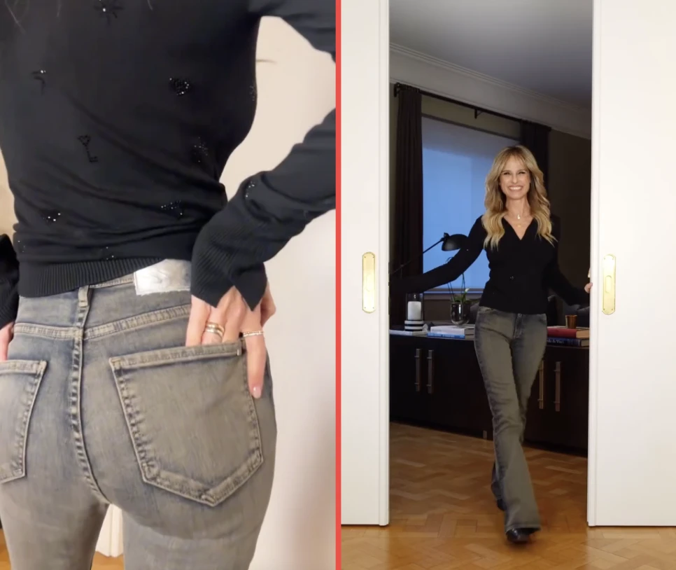Una de sus primeras combinaciones, ideales para una salida relajada de fin de semana o para ir a la oficina, está compuesta por un suéter negro con un curioso tajo en los puños y detalles bordados. Lo combinó con un jean de corte clásico con un matizado en color chocolate, una de las tendencias de esta temporada.