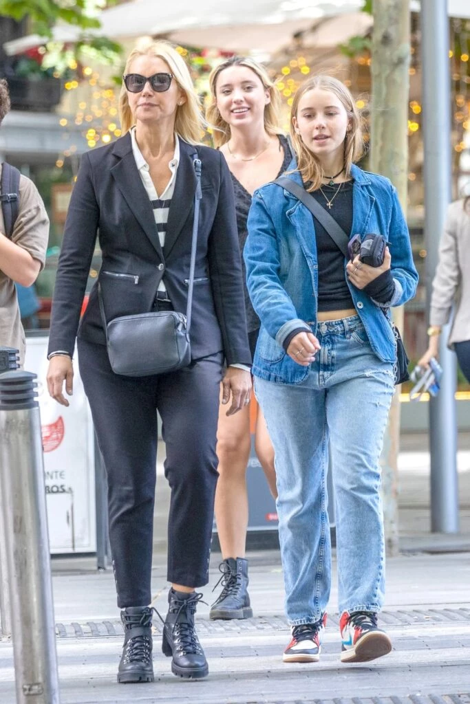 El atuendo de la esposa de Alejandro Gravier con el que se mostró paseando por las calles de Madrid junto a su hija Taína Gravier con un conjunto compuesto por un saco y un pantalón de vestir negro.