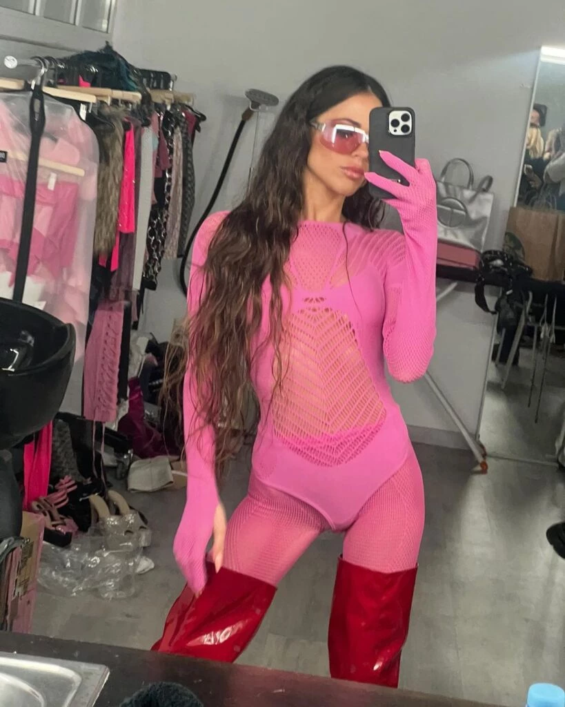 En varios de sus conciertos, Tini Stoessel apostó por las piezas red, que ha usado en: enterizos, crop top, y hasta guantes. En su más reciente look con esta tendencia, se decidió por el negro, pero antes lució un total pink del que todos sus fanáticos hablaban, y al que le hizo juego perfectamente para un videoclip, con lentes de sol, y botas altas en rojo.