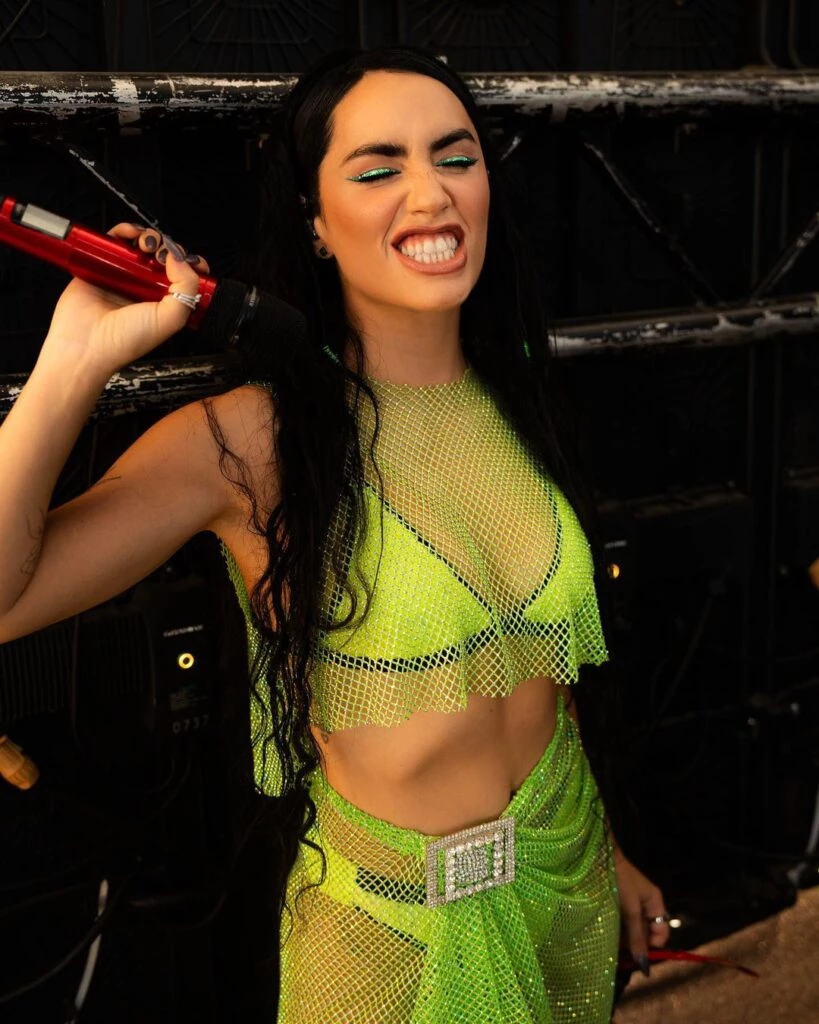 Lali por su parte, deslumbró en sus recitales por Europa con un llamativo look de red en color verde, de mini falda y top. Para la cantante de 'Disciplina' no existen límites cuando se habla de su estilismo para los shows, y combinó su outfit con la malla de brillos, y agregó un detalle que no pasó desapercibido: una hebilla plateada con strass en la parte inferior.