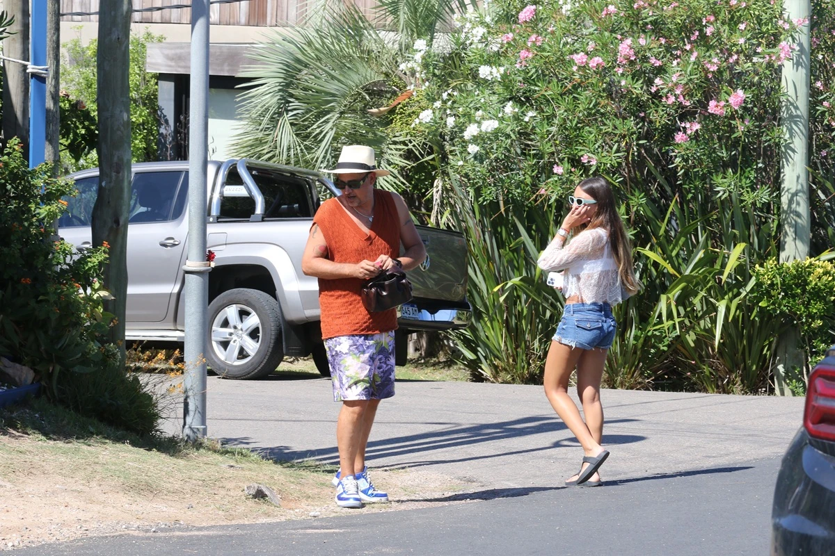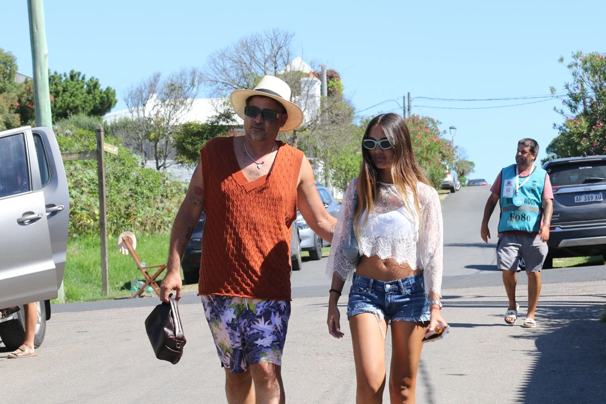 Los looks acompañaron perfectamente el clima veraniego. Chano optó por un estilo relajado y personal: musculosa tejida en tono terracota, short estampado en colores claros, zapatillas deportivas azules y blancas, sombrero claro de ala corta y anteojos de sol oscuros. Un outfit cómodo, playero y con guiños bohemios, muy en línea con el espíritu de José Ignacio. Como accesorio, llevó un pequeño bolso de cuero en la mano, práctico y canchero.