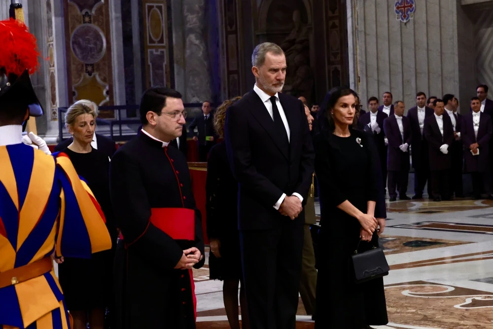 Allí estuvo la delegación española, encabezada por el rey de España, Felipe VI, y la reina consorte Letizia Ortiz, quienes presentan sus respetos ante los restos del Papa Francisco minutos antes del inicio de la ceremonia en el que los restos del Sumo Pontífice fueron enterrados en la Basílica de Santa María la Mayor, el lugar elegido por el propio Papa.