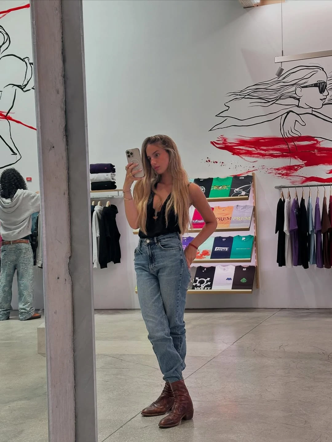 Después, el álbum se corre a un escenario más de paseo y shopping: Charo aparece posando frente a un espejo en un local, con un outfit más nocturno —top negro, jeans y botas marrones—, mientras el fondo muestra percheros y remeras de colores. Un detalle que refuerza el clima de viaje: el tiempo sin apuro, las caminatas y el disfrute de compartir planes.