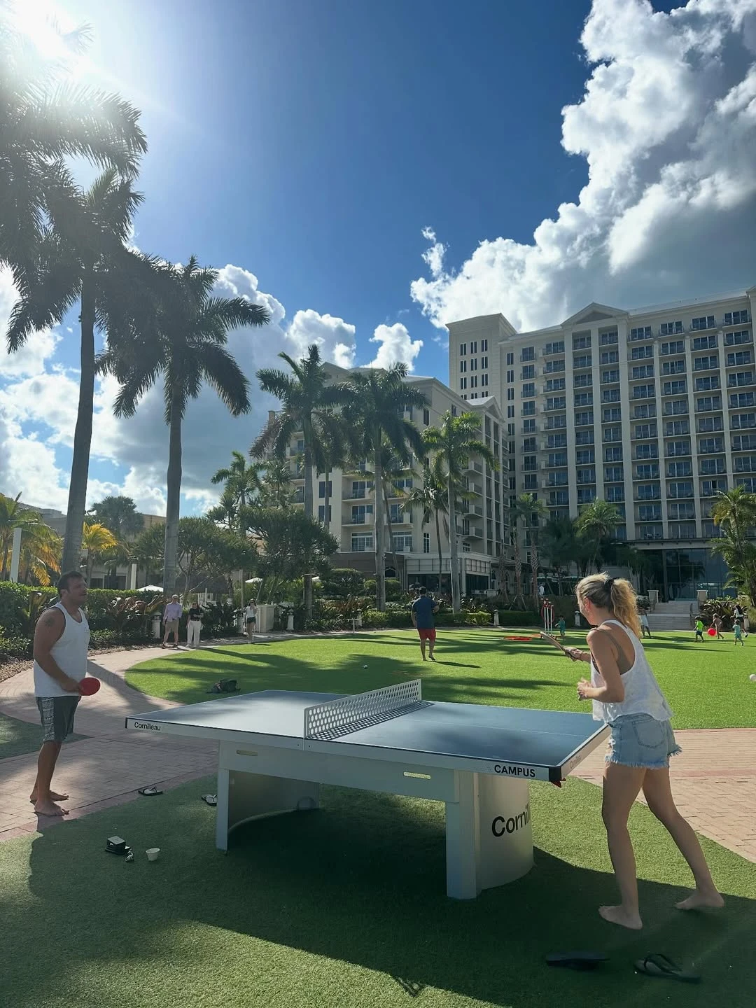 El carrete también incluye imágenes que ubican el destino en clave bien veraniega: palmeras, cielo azul intenso, edificios altos y una postal de resort. En una de las fotos, incluso se ve una escena distendida al aire libre, con gente jugando ping pong bajo el sol, como parte de un día típico de vacaciones.
