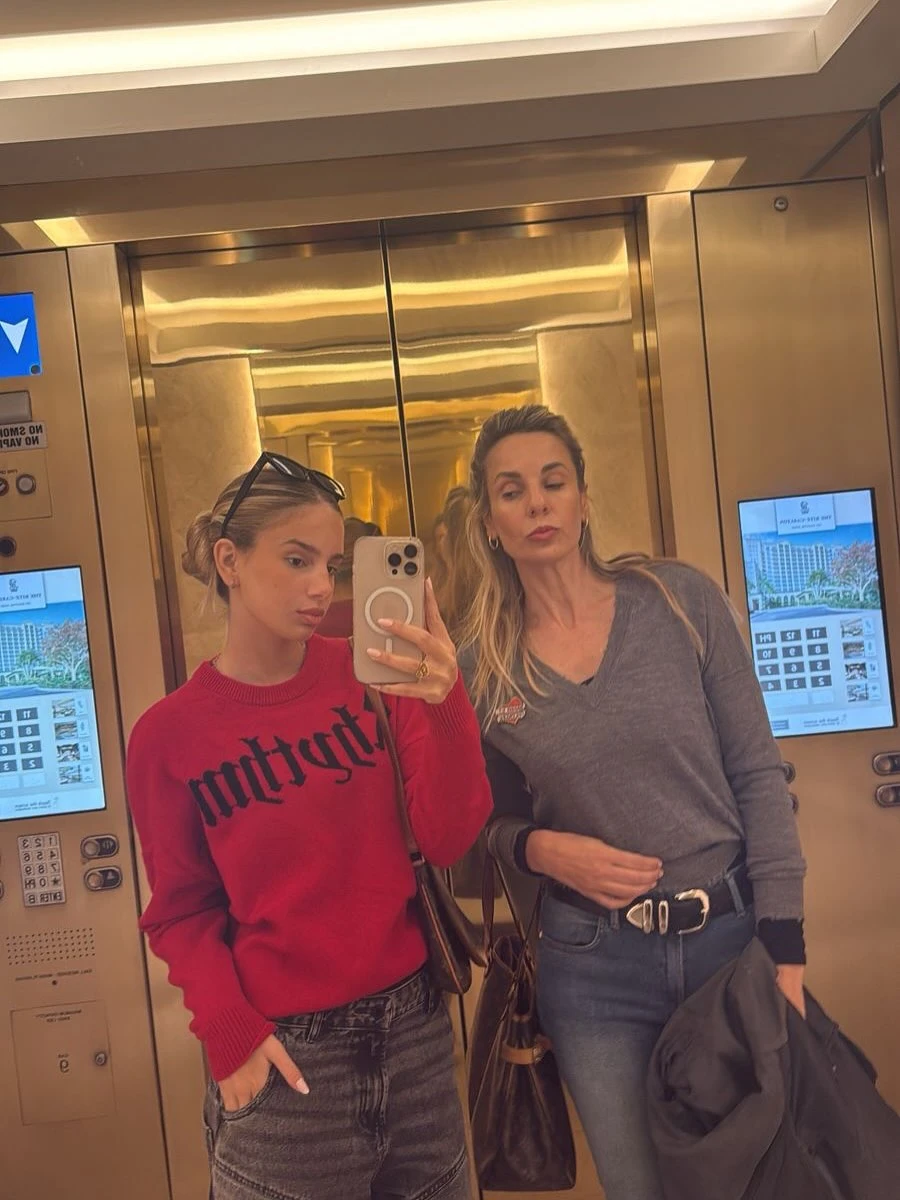 En una de las imágenes, ambas se muestran en un espejo de ascensor, en modo selfie, con looks urbanos y cancheros: Charo con sweater rojo, jean oscuro y el pelo recogido, y Julieta con jeans, suéter gris y una actitud divertida, como si estuvieran arrancando el día o volviendo de una salida.