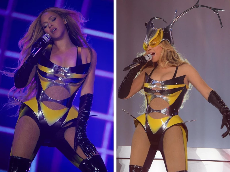 Entre los bodies o catsuits más llamativos que usó hasta ahora la texana sobre el escenario, se encuentra el diseño personalizado de Mugler, que completa con antenas imponentes y gafas de sol con forma de insecto.